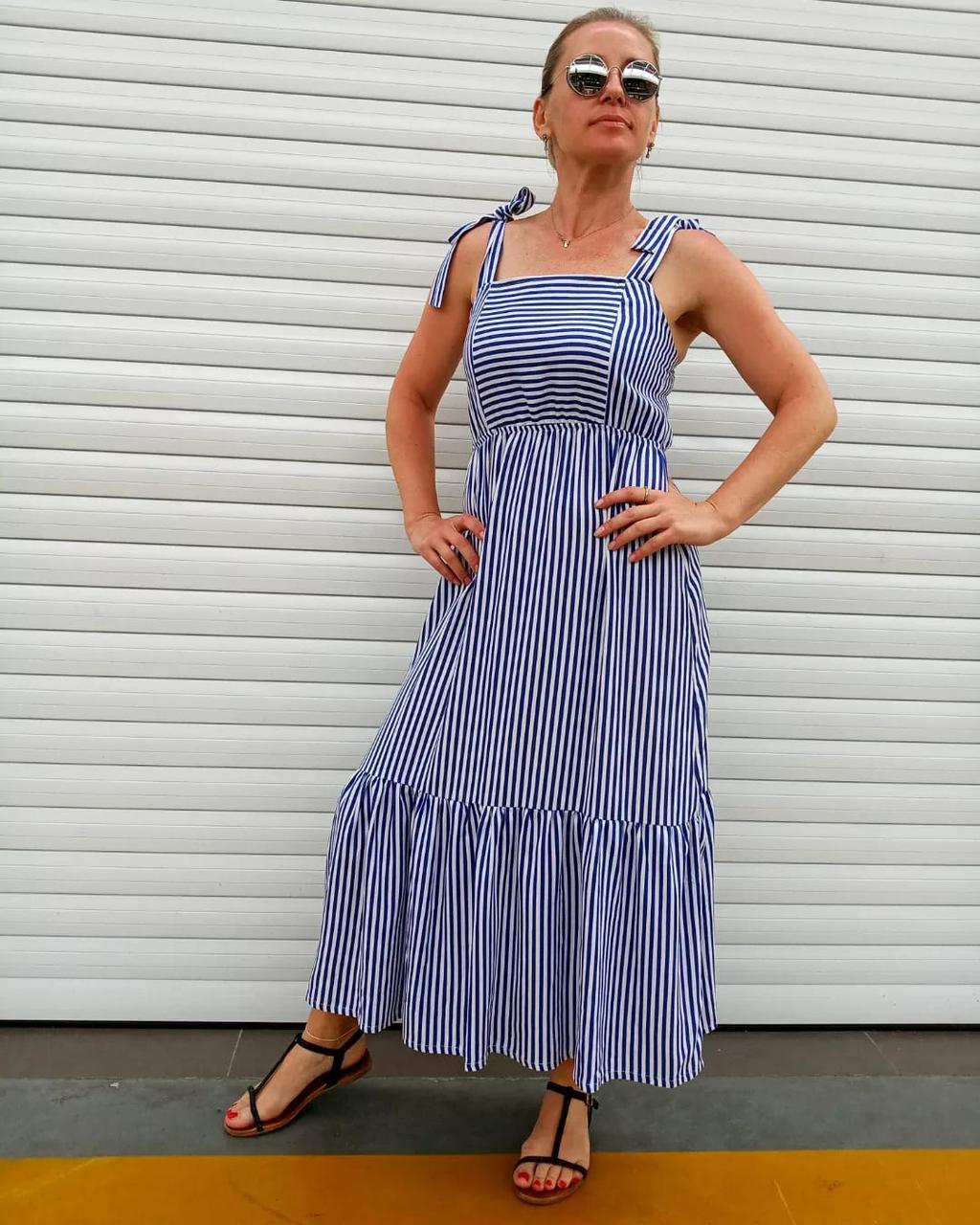 Літній легкий сарафан на бретелях-зав'язках з рюшів, колір — білий у синю смужку, склад — 100% бавовна, довжина — міді