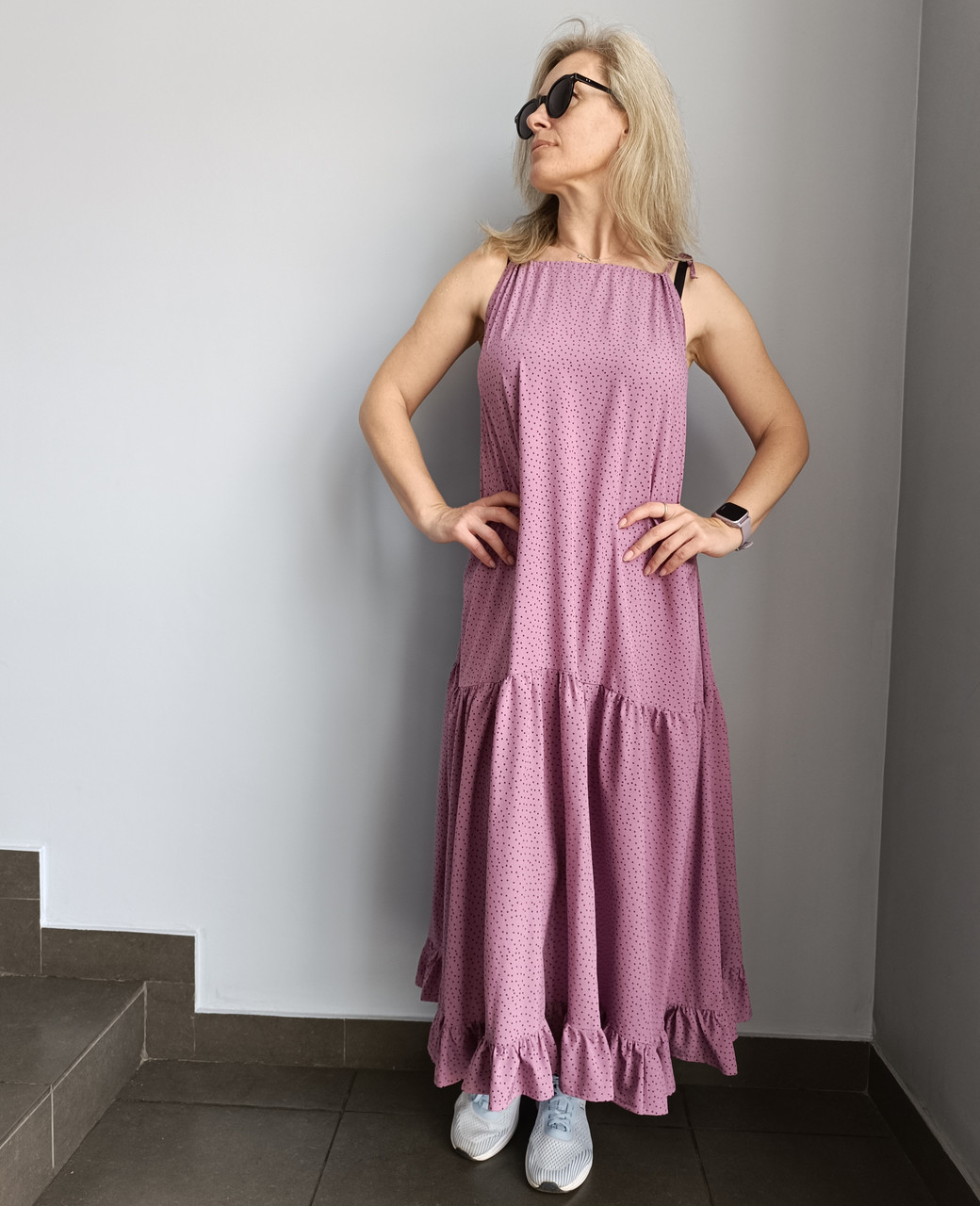 Бузковий легкий довгий сарафан у дрібний чорний горошок на зав'язках.